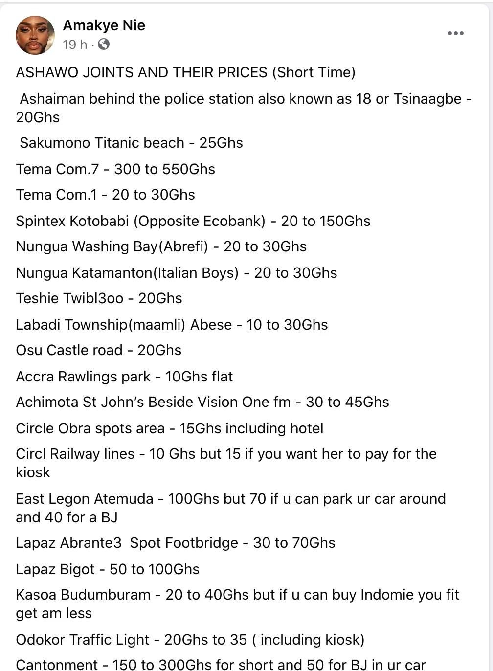 A Ghanaian Facebook user, Amakye Nie, has curated a list of popular Ashawo joints in the Greater Accra Region and their prices.