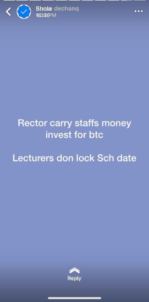 Correctng.com reported that after the central bank’s ban on cryptocurrency transactions, the rector identified as Mr. Oladebeye was alleged to have informed the lecturers of the fate of their monies and this caused uproar as he could not refund it back to them.