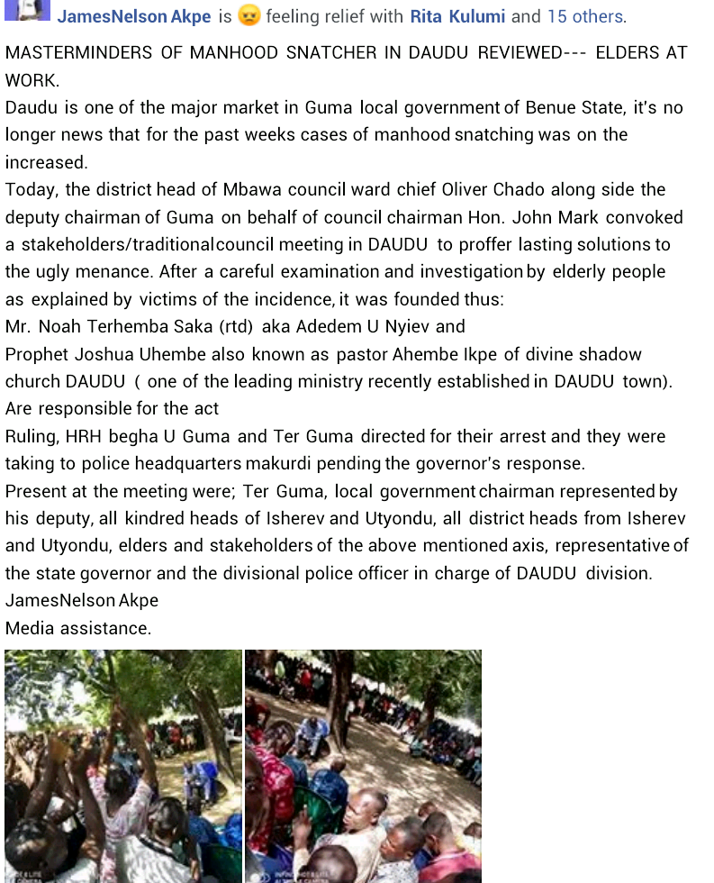 “Daudu is one of the major markets in Guma local government of Benue State, it’s no longer news that for the past weeks' cases of manhood snatching was on the increase.