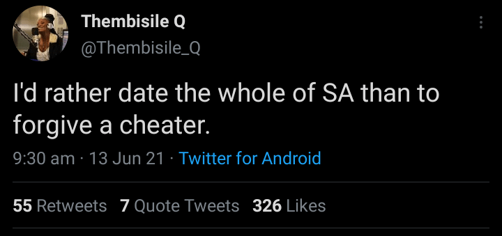 I’d rather date the whole of SA than to forgive a cheater,” @thembisile_Q wrote on Twitter which got many people reacting.
