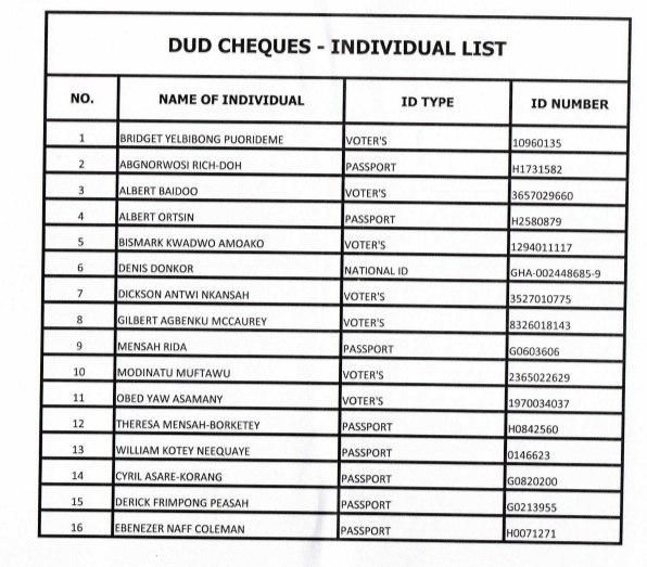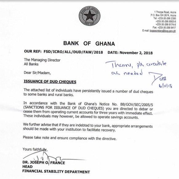 In a statement issued by the BoG, it said that “You are directed to debar or cease them from operating current accounts for three years with immediate effect. We further advise that if they are indebted to your bank, appropriate arrangements should be made with your institution to facilitate recovery”.