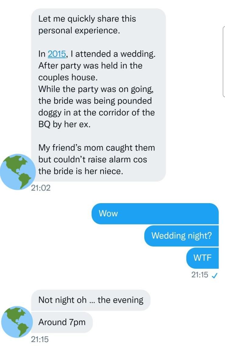 A Nigerian man has shared the story of a lady cheating with her ex-boyfriend on the day she tied the knot with another man.