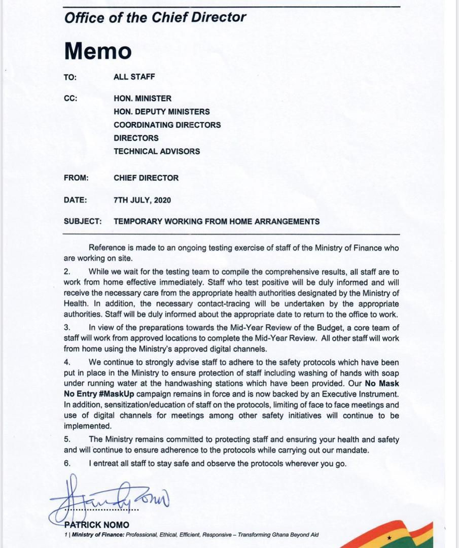 The <a href="https://www.pulse.com.gh/news/local/ken-ofori-atta-to-present-govts-coronavirus-fight-policy-in-parliament-today/s8r3y8t">Ministry of Finance</a> has directed its staff to work from home in the wake of the Coronavirus pandemic.