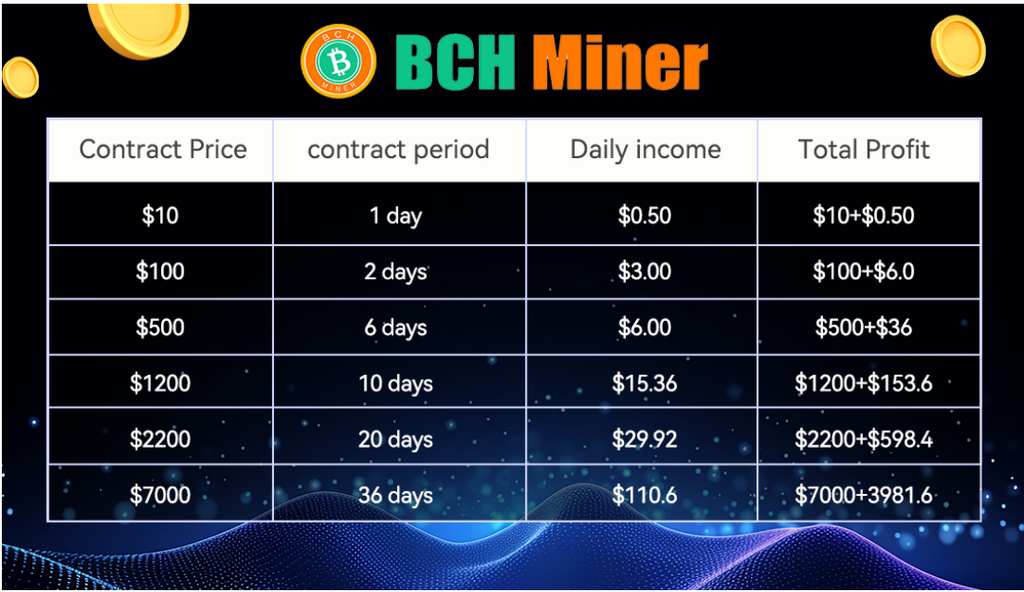 BCH Miner takes cloud mining simplicity to a new level, making it ideal for beginners. The platform’s user-friendly interface ensures that even cryptocurrency newbies can navigate it with ease. For BCH Miner , laziness is not a weakness; it’s the path to success. As a pioneer in providing cloud mining services, BCH Miner has multiple mining facilities around the world and has won the trusted support of more than 5 million users worldwide with its stable income and security . BCH Miner relies on renewable energy such as solar and wind power to power its cloud mining operations, which greatly reduces mining costs and integrates excess electricity into the grid. This means you can get a lot of mining power without having to buy expensive hardware or deal with noise and heat at home. All you need is your computer or mobile phone to sign a mining contract and start reaping the rewards. The profit potential is beyond imagination.