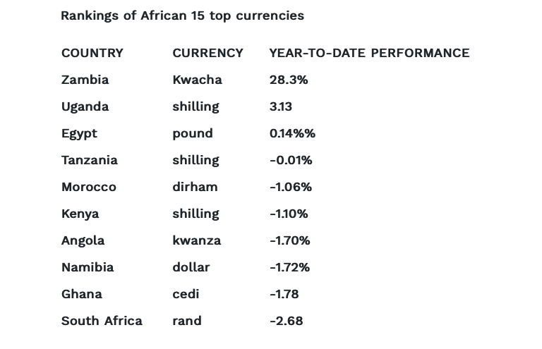 The report showed that the Zambian Kwacha is the number currency on the continent. It appreciated 28% to the US dollar.