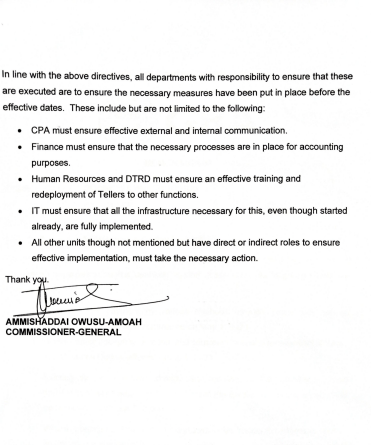 This was contained in a memo signed by the GRA’s Commissioner-General, Ammishaddai Owusu-Amoah.