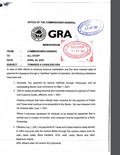 The memo noted that effective June 1, 2021, the GRA will cease accepting personal and corporate cheques for payment of taxes and custom duties.