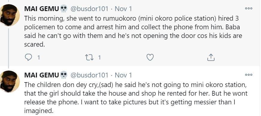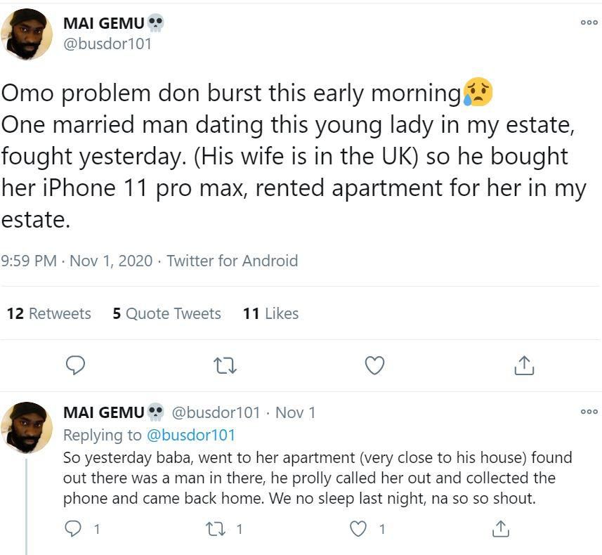 According to a young man identified as Busdor101 on Twitter, the married man’s wife lives in the UK and whiles the side chick is his neighbour in Nigeria.