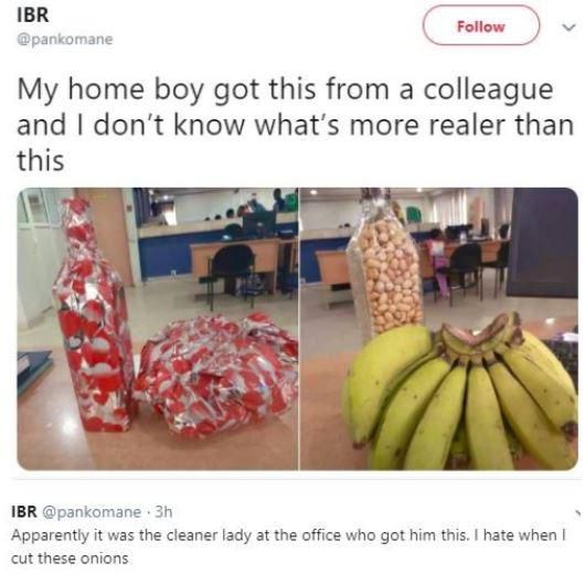 A twitter user identified as @pankomane posted a photo of the gifts with a caption: “My home boy got this from a colleague and I don’t know what is realer than this.”