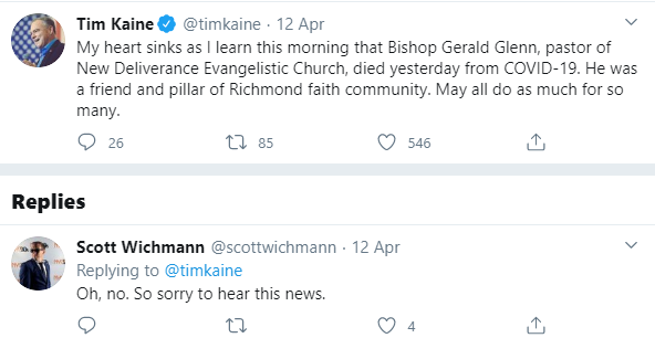 "My heart sinks as I learn this morning that Bishop Gerald Glenn, pastor of New Deliverance Evangelistic Church, died yesterday from COVID-19. He was a friend and pillar of Richmond faith community. May all do as much for so many," Senator Tim Kaine tweeted.