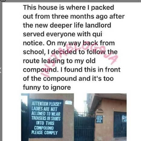 In sharp contrast with the contemporary trends and ‘modernisation’, a notice pasted on the walls of a conservative Deeper Life Church landlord in Achara, Enugu state, Nigeria explicitly bans wearing of trousers by his female tenants and their female visitors in his house.