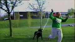 Watch as this clever dog steals the hose from his owner and chases him around the yard.