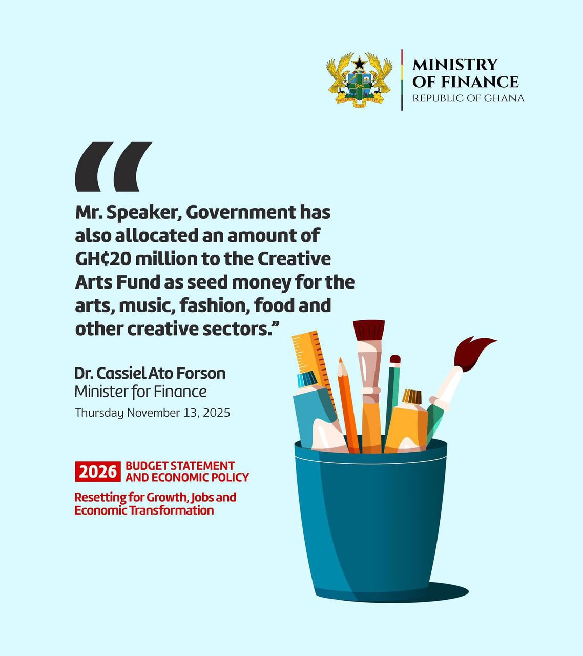 He further disclosed additional support for the broader creative economy, stating: "Government has also allocated an amount of GH¢20 million to the Creative Arts Fund as seed money for the arts, music, fashion, food and other creative sectors."