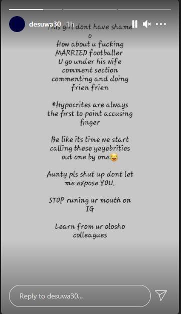 "This girl doesn't have shame o. How about you fucking a married footballer. You go under his wife's comment section commenting and doing frien frien," she wrote.