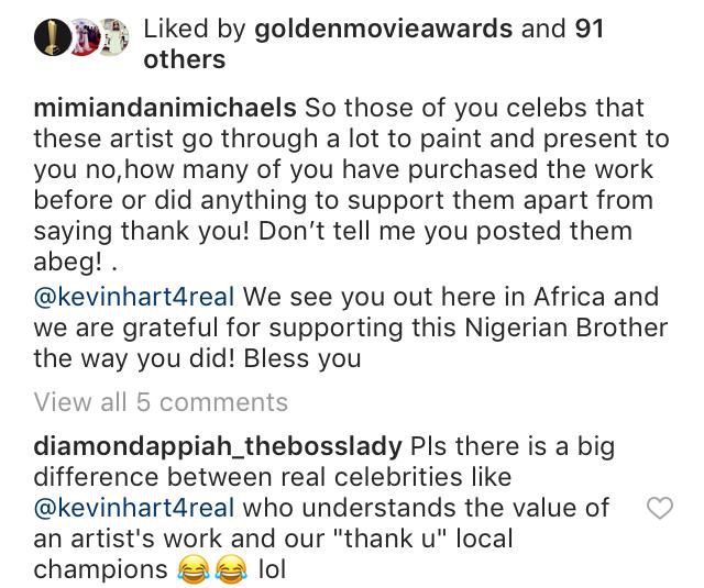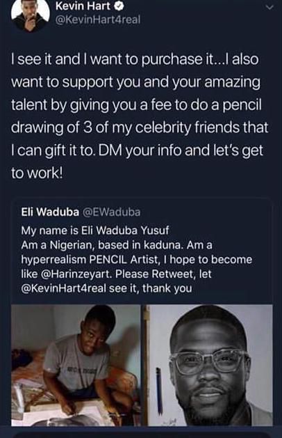 Kevin Hart, replied his tweet saying that he has seen the work and he would love to purchase it and support him by giving him some more money to draw some of his celebrity friends.