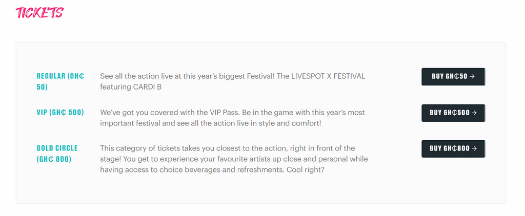 However, it could also cost as low as Gh50 for anyone who wants to be at the concert but as usual, the cheaper the ticket, the farther the distance to be closer to where the action is happening. See the screenshot below for the ticket details.