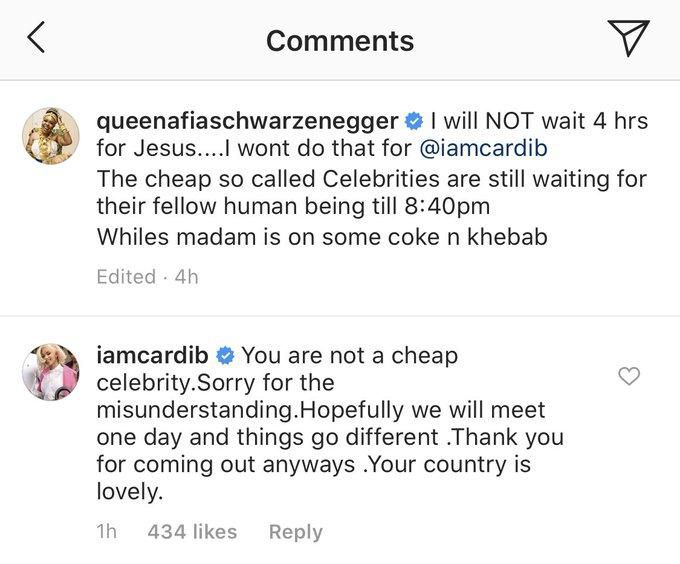 Cardi B who has disclosed she was not aware of people waiting for a ‘meet and greet’ but still made it out there replied Afia’s post on Instagram.