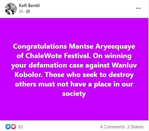 "Congratulations Mantse Aryeequaye of ChaleWote Festival. On winning your defamation case against Wanluv Kobolor. Those who seek to destroy others must not have a place in our society," he wrote on his Facebook wall.