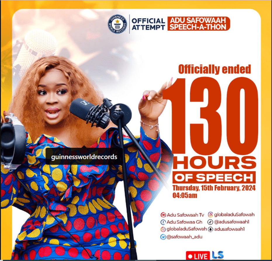 Ghanaian actress Regina Adu Safowaah on Thursday, February 15, 2024, completed her attempt at the Guinness World Records (GWR) longest speech marathon by an individual.