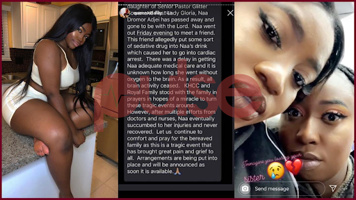 Naa Dromo, popularly known on Instagram as Ahoufedua, was a cosmetologist and daughter of Senior Pastor Gliter Sower. Read more about her sad death in the screenshot below.