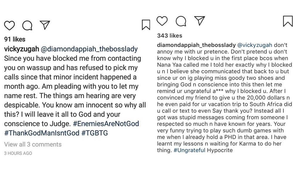 Vicky Zugah and Diamond Appiah beef on Instagram