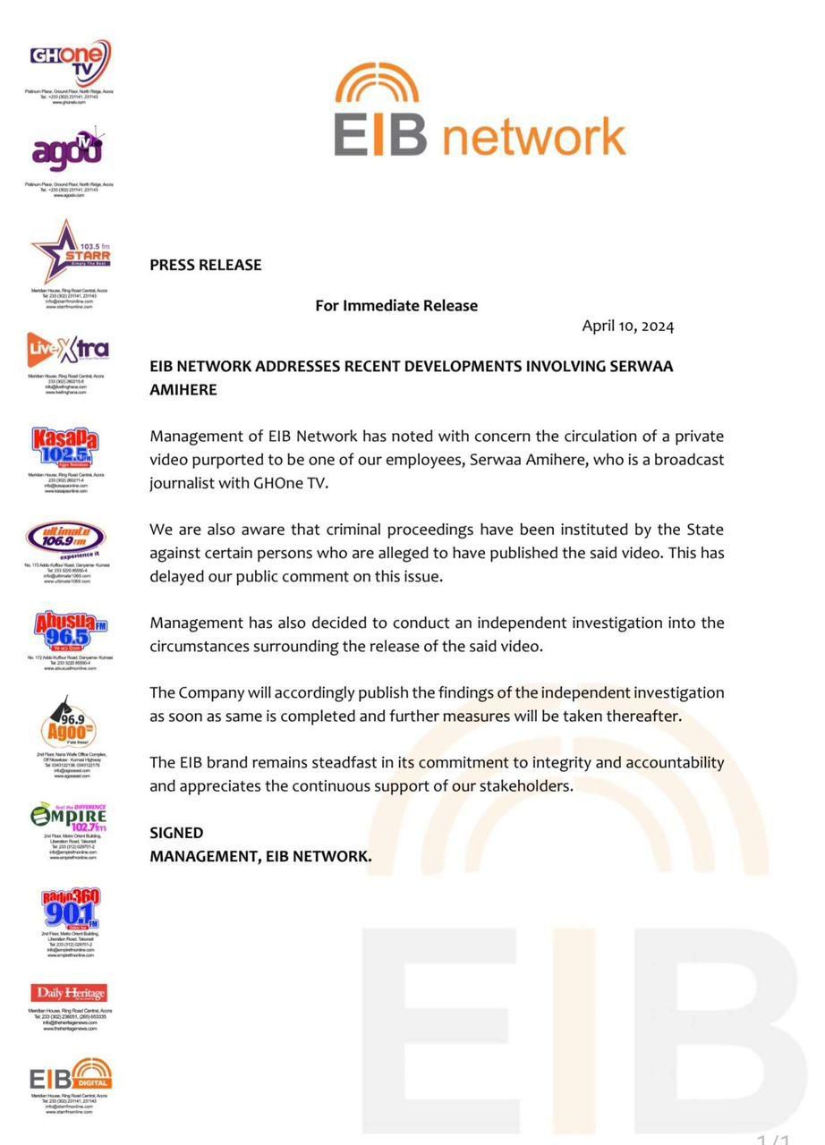 The media house that owns GhOne TV has pledged to disclose the findings to the public as soon as they become available. The management of EIB Network emphasized the importance of upholding the values of integrity and accountability within the organization.