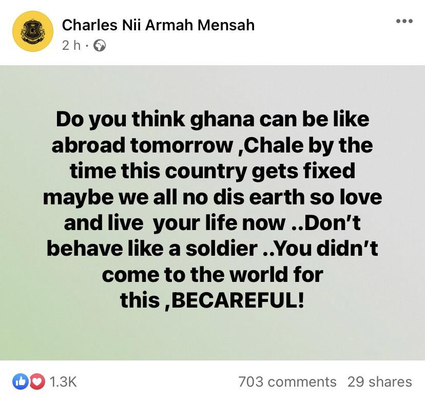 The dancehall act's comments are coming at the back of the outrage on social media over the military shooting in Ejura that has claimed the lives of two people who were protesting over the murder of #FixTheCountry campaigner Mr Ibrahim Muhammed, aka Kaaka.