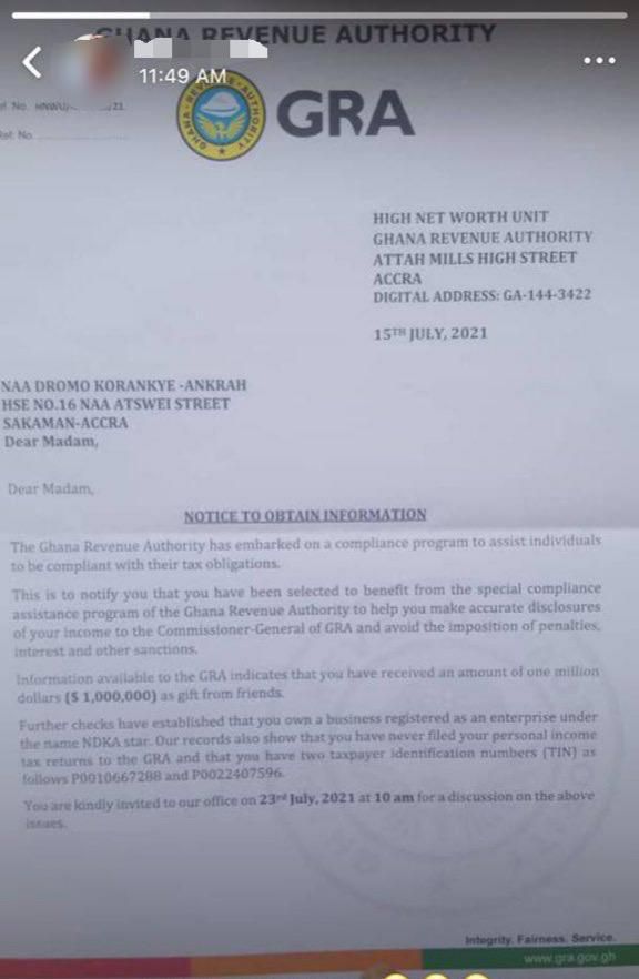 Further checks have established that you own a business registered as an enterprise under the name NDKA star. Our records also show that you have never filed personal income tax returns to the GRA and that you have two taxpayer-identification numbers (TIN) as follows P0010667288 and P0022407596," the GRA stated while notifying Naa Dromo to make herself available at its office on July 23, 2021, at 10 am.
