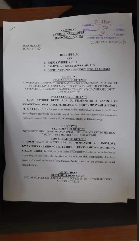 Concerning the leaked intimate video of Serwaa Amihere and Henry Fitz, a police complaint has been filed and some three (3) persons have been charged for the crime of distributing intimate videos contrary to the Cybersecurity Act 2020.