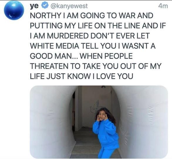 Hours after that post, the "Ye" rapper tweeted "Northy I am going to war and putting my life on the line and if I am murdered don’t ever let white media tell you I wasn't a good man".