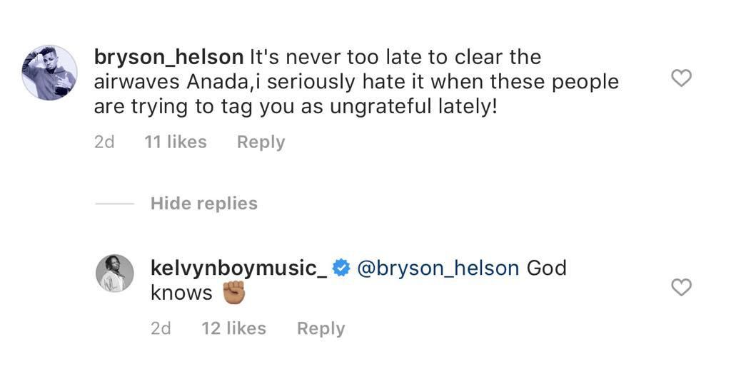 Dropping a comment under a post by Kelvyn Boy, @bryson_helson wrote: “it’s never too late to clear the airwaves Anada. I seriously hate it when the people are trying to tag you as ungrateful lately!” In reply, the singer wrote“God Knows” and added an emoji to depict peace.