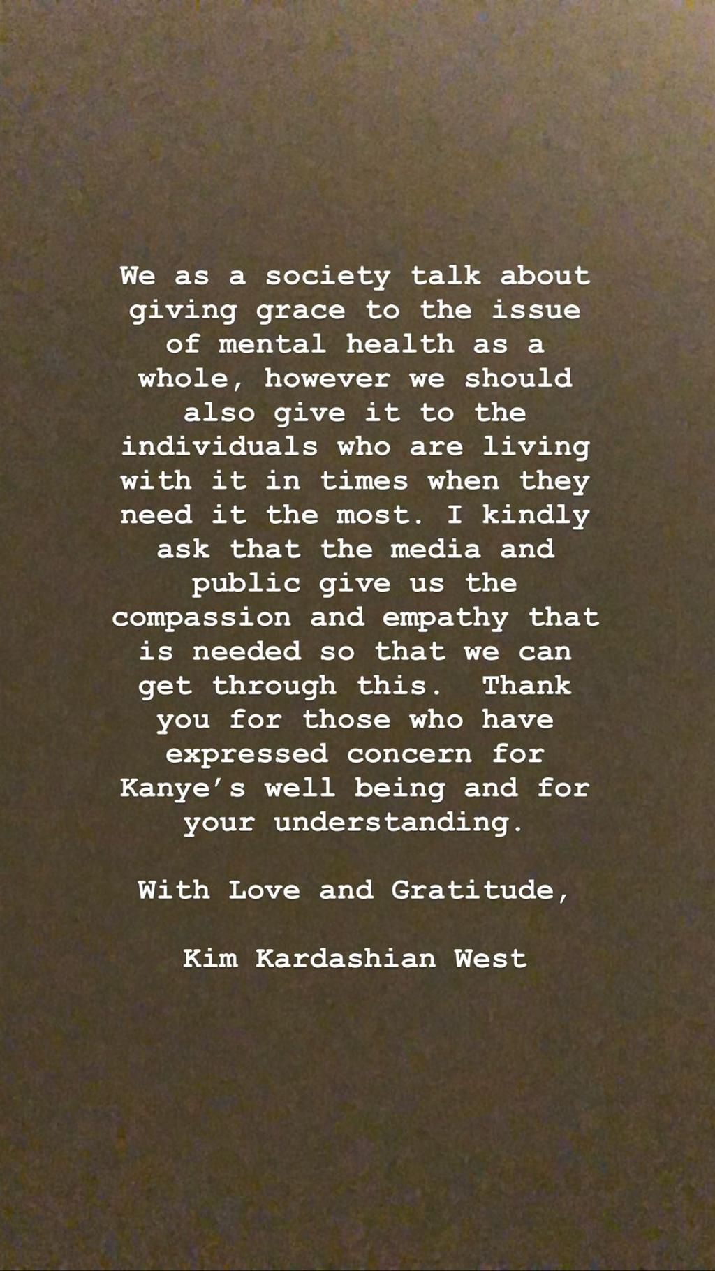 Finally, she appealed to the public to show compassion and empathy towards her family as they struggle with Kanye's illness.