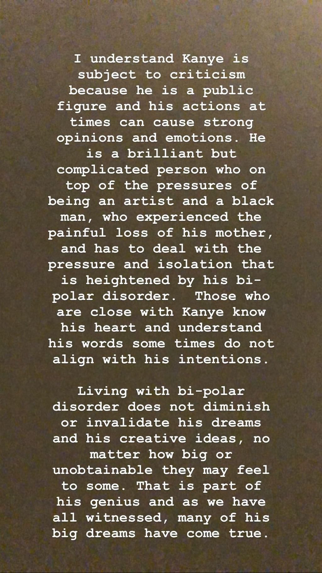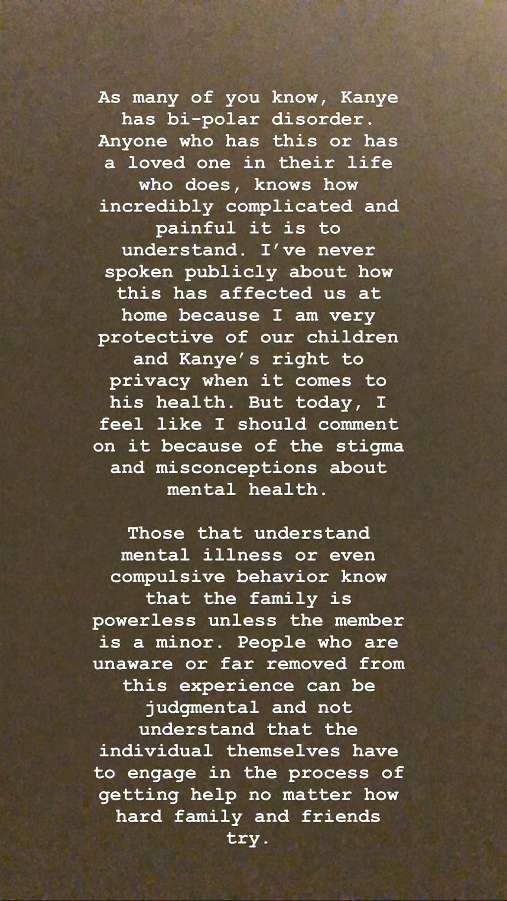 "I have never spoken publicly about how this has affected us at home because I'm very protective of our children and Kanye's right to privacy when it comes to his health,"she wrote.