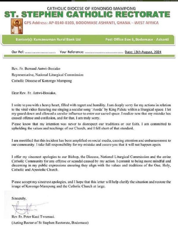 Earlier, it was reported that a letter signed by Reverend Father Peter Twumasi, the Catholic priest who sang King Paluta's song during mass, had appeared online.