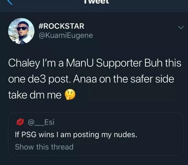 The musician's request came after the UEFA Champions League match between Manchester United and Paris Saint-Germain (PSG) as one Twitter user, @_esi, promised to release her nudes should PSG beat Manchester United.