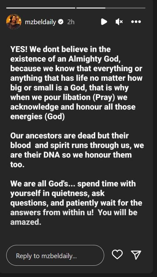 “YES! We dont believe in the existence of an Almighty God, because we know that everything or anything that has life no matter how big or small is a God, that is why when we pour libation (Pray) we acknowledge and honour all those energies (God). Our ancestors are dead but their blood and spirit runs through us, we are their DNA so we honour them too,” she wrote.