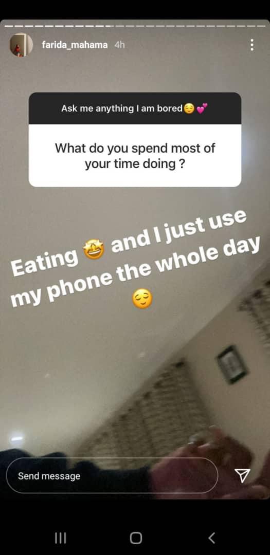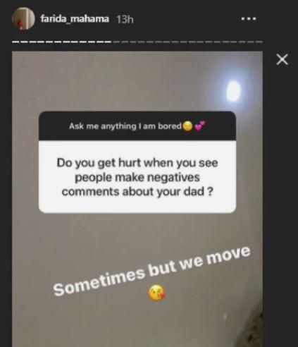 Farida during an interaction with her followers on Instagram, allowed questions from her followers and one person asked if she gets hurt by the negative comments about her father and in her reply, she said 'sometimes'.