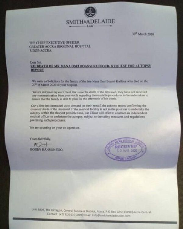 Smith & Adelaide, lawyers for Obour, served the Chief Executive Officer of Greater Accra Regional Hospital a letter to carry out the necessary post-mortem to determine the cause of death of his father.