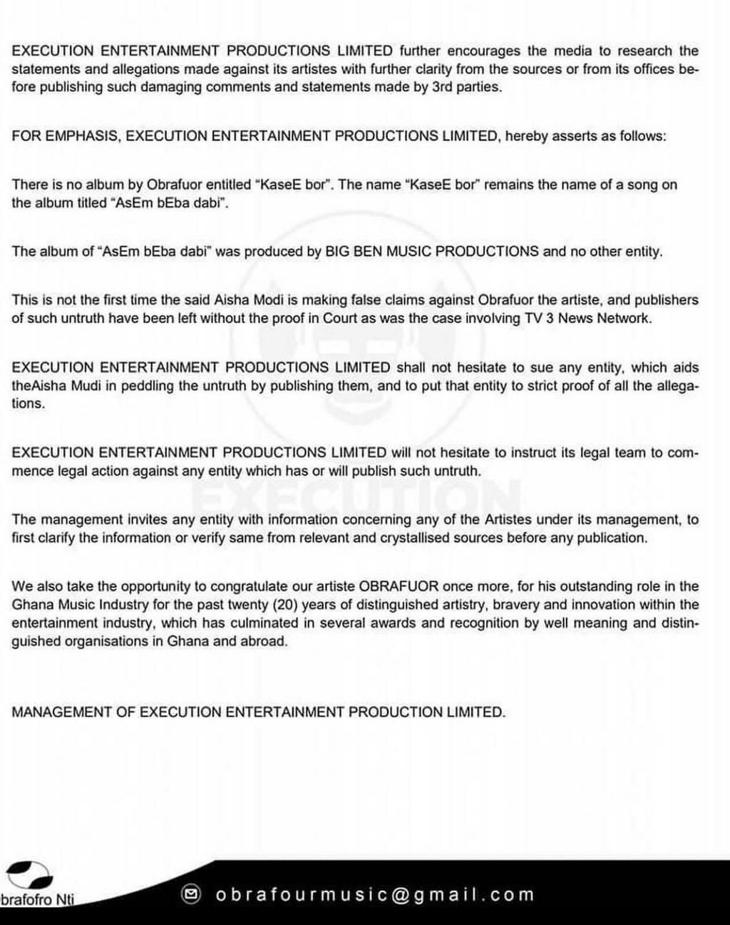In a press release from Execution Entertainment which is Obrafour's management body, the rapper has threatened to sue Aisha over comment over claims that her statement is an attempt to reduce Obrafour’s relevance.