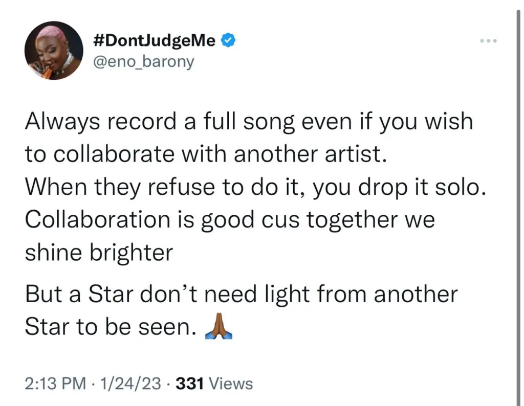 Eno Barony wrote on Twitter: “Always record a full song even if you wish to collaborate with another artist. When they refuse to do it, you drop it solo.