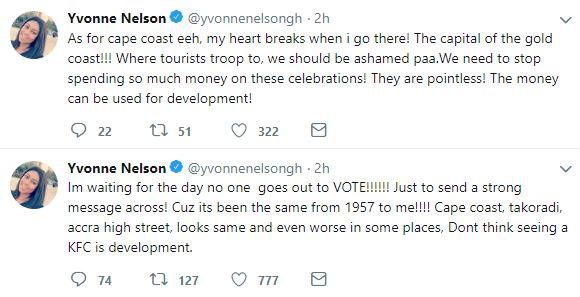 “As for cape coast eeh, my heart breaks when I go there! The capital of the gold coast!!! Where tourists troop to, we should be ashamed paa. We need to stop spending so much money on these celebrations! They are pointless! The money can be used for development!” she tweeted.