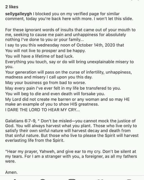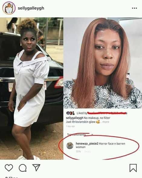 In 2020, A social media user who has been persistently trolling Ghanaian actress Selley Galley was called out and cursed by the actress. The social media user identified as Henewaa_Piesie2 called the actress "horror face and barren woman" in a comment.