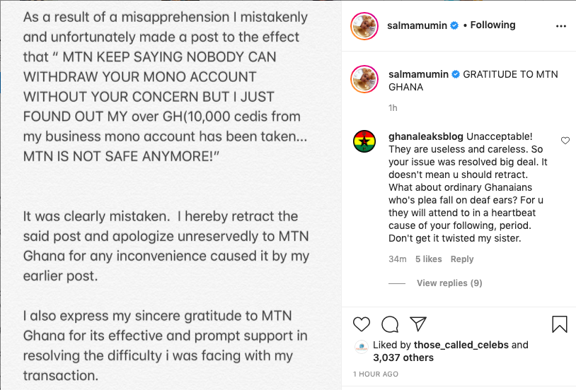 The actress was speaking on UTV about her claim that about GH10,000 was stolen from her MOMO account by MTN. Salma later retracted her claims and apologize over the misleading post after MTN threatened to sue her with details that she had no such amount in her account.