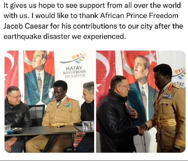 In a tweet, he said “it gives us hope to see support from all over the world with us. I would like to thank African Prince Freedom Jacob Caesar for his contributions to our city after the earthquake disaster we experienced".