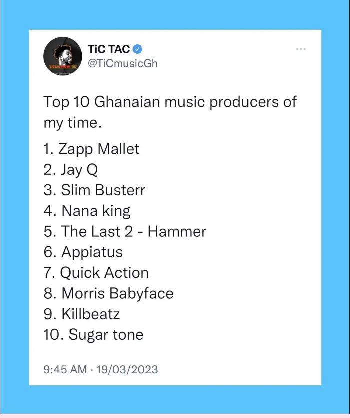 Having worked with several music producers in Ghana, Tic Tac has named his all-time top ten producers the country Ghana has been blessed with.