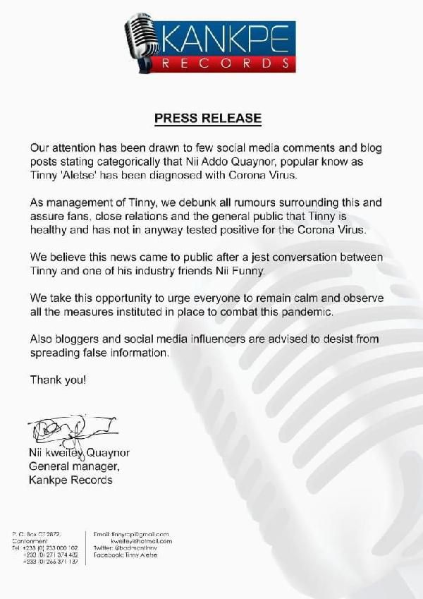 It assured Tinny’s fans, family and Ghanaians that Tinny is fine and healthy and has in no way tested positive to the deadly coronavirus.