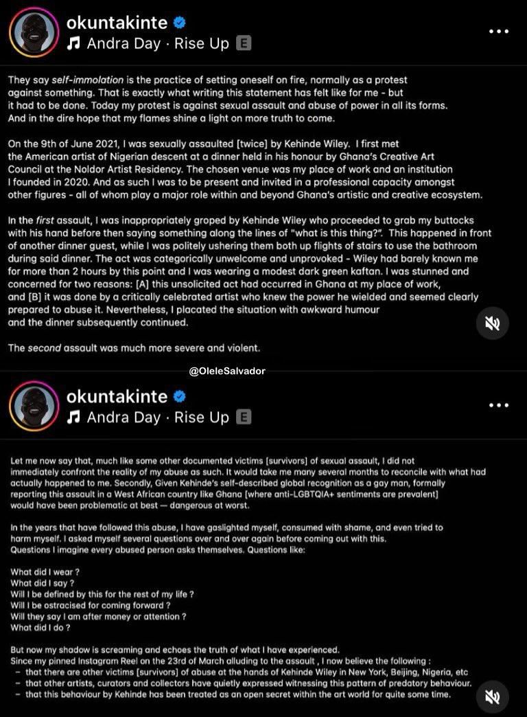 He stated, "On the 9th of June 2021, I was sexually assaulted [twice] by Kehinde Wiley. I first met the American artist of Nigerian descent at a dinner held in his honour by Ghana's Creative Art Council at the Noldor Artist Residency. The chosen venue was my place of work and an institution I founded in 2020. And as such, I was to be present and invited in a professional capacity amongst other figures - all of whom play a major role within and beyond Ghana's artistic and creative ecosystem."