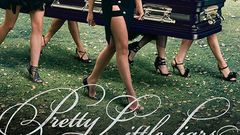 The poster features all five girls — Aria, Hanna, Emily, Spencer and Alison, rocking their sexy little black dresses for a strut through the cemetery, carrying a giant casket.
