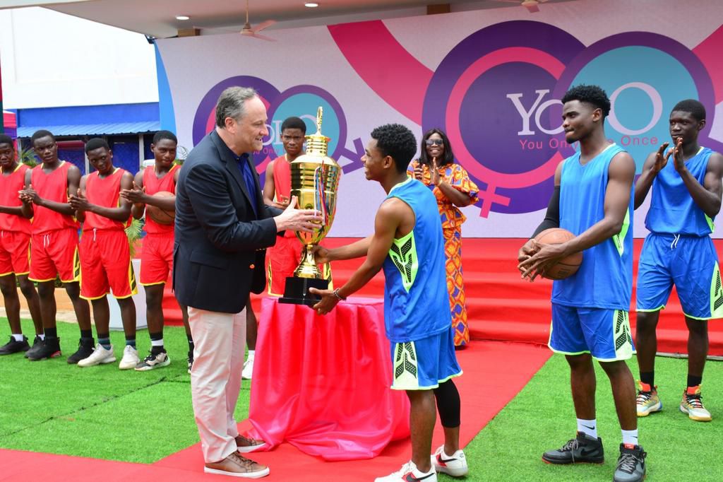 Mr. Emhoff handed over the trophy to the winning team during the interschools basketball competition.