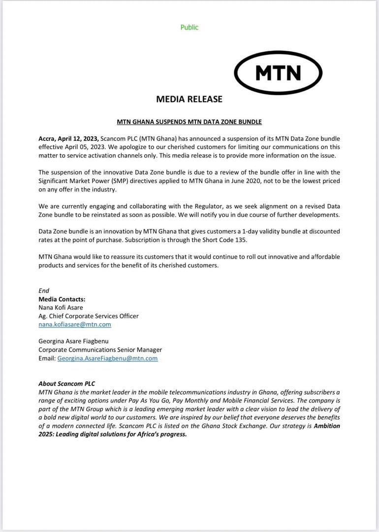 MTN issues apology to subscribers after cancelling Data Zone bundle12 April 2023 at 17:38ShareMTN Ghana has finally issued on statement on cancelling its zone bundles.MTN Côte d'Ivoire - LogoSSelorm TaliFollowSubscribe to receive daily news updates.SubscribeAccept Terms and Privacy PolicySSelorm TaliFollow
